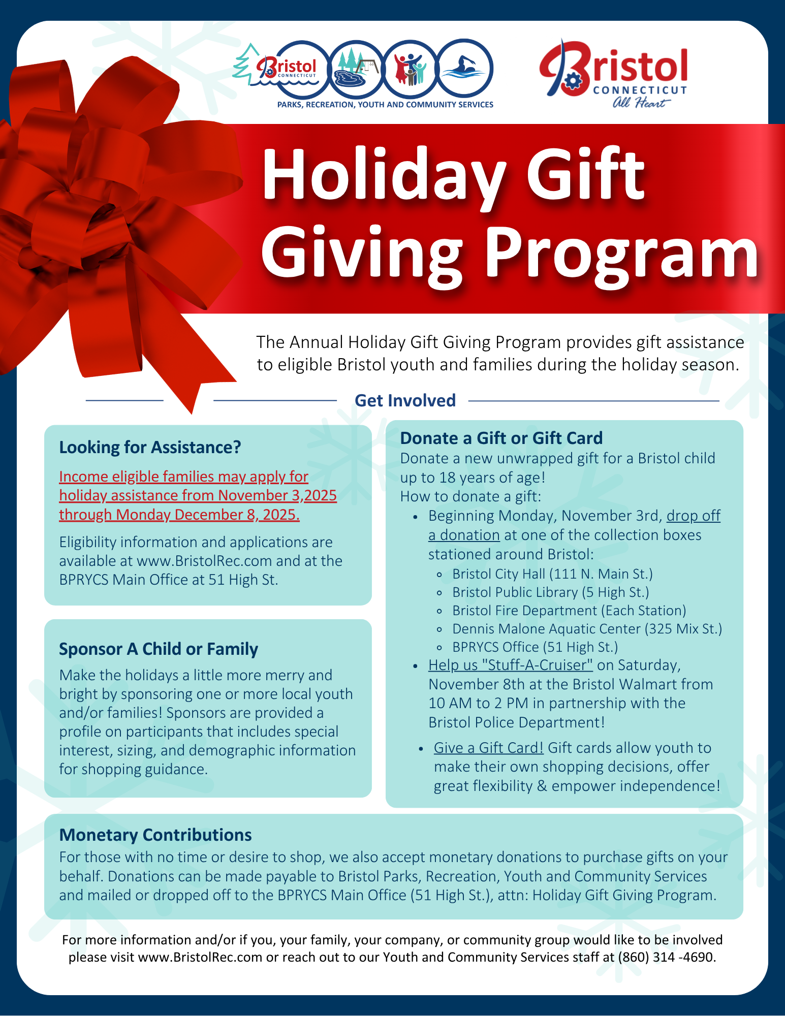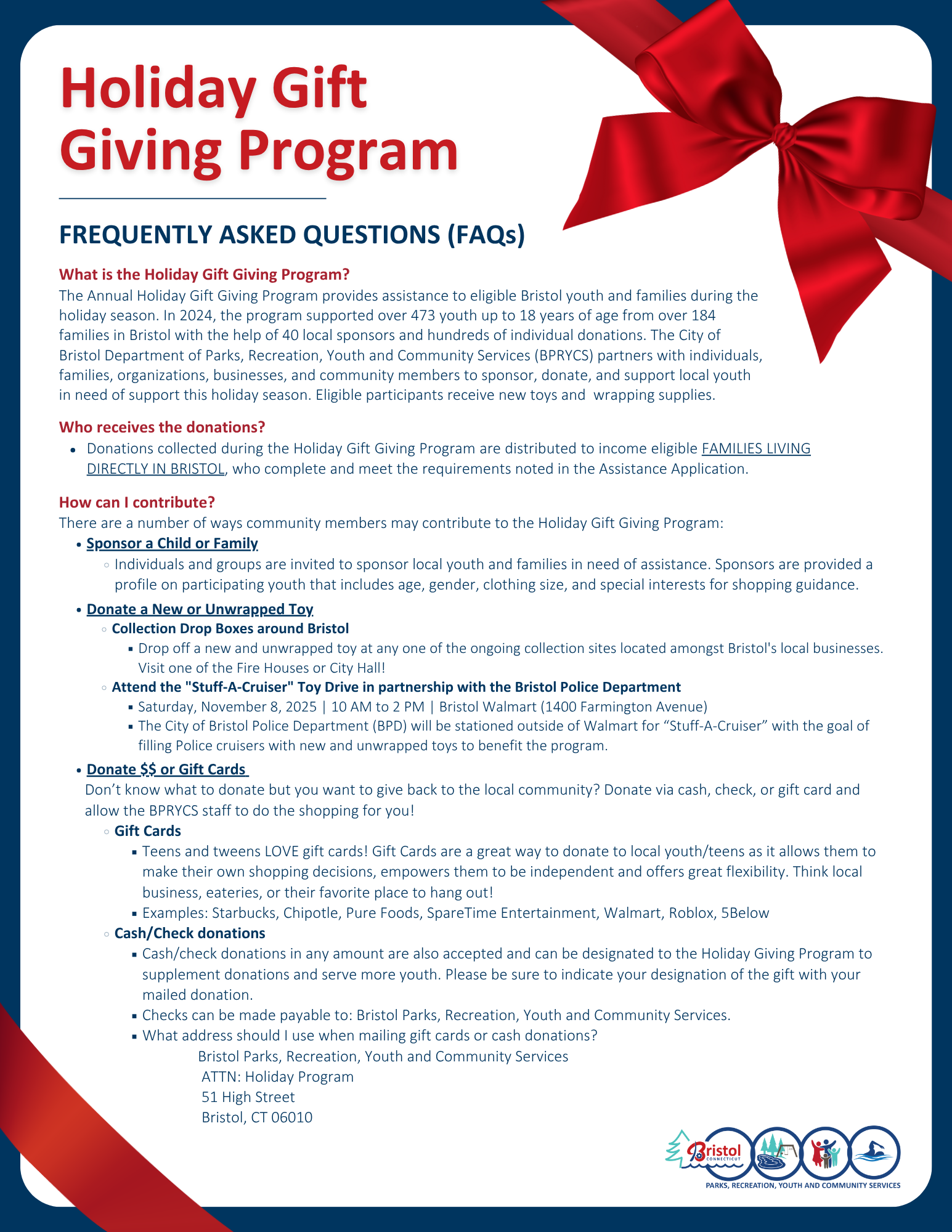 For those with no time or desire to shop, we also accept monetary donations to purchase gifts on your behalf. Donations can be made payable to Bristol Parks, Recreation, Youth and Community Services and mailed or dropped off to the BPRYCS Main Office (51 High St.), attn: Holiday Gift Giving Program.
