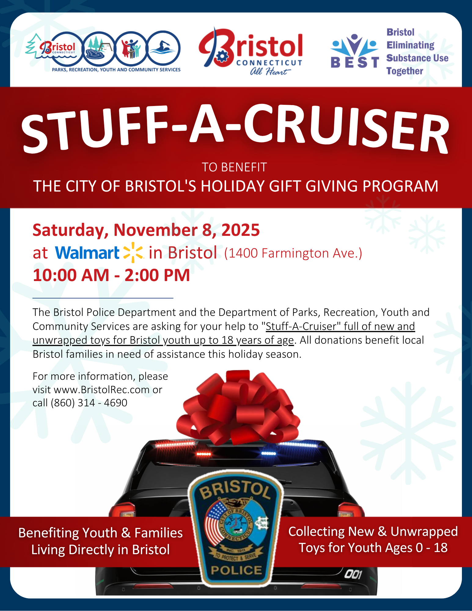 - Help us "Stuff-A-Cruiser" on Saturday, November 8th at the Bristol Walmart (1400 Farmington Ave.) from 10AM to 2PM in partnership with the Bristol Police Department!