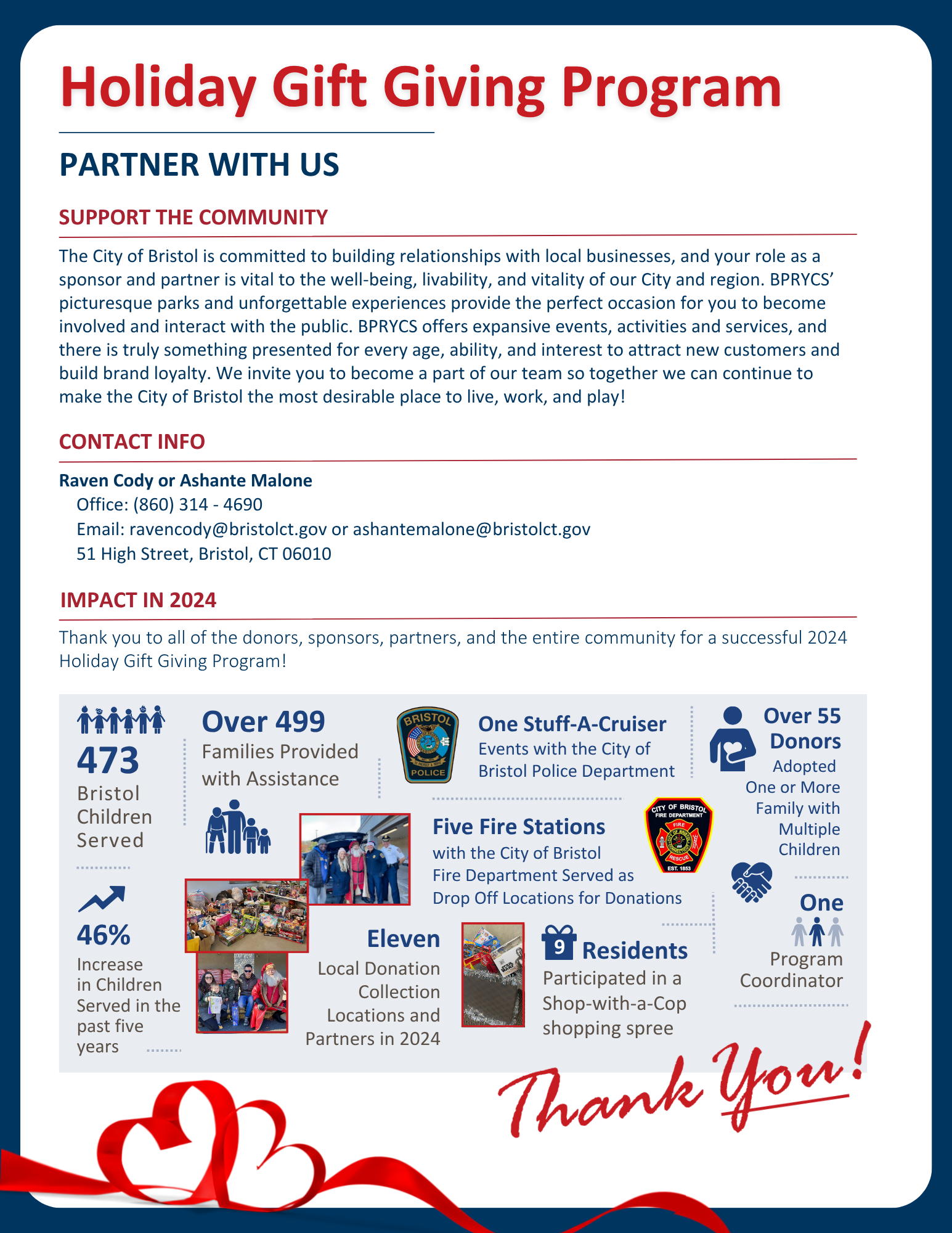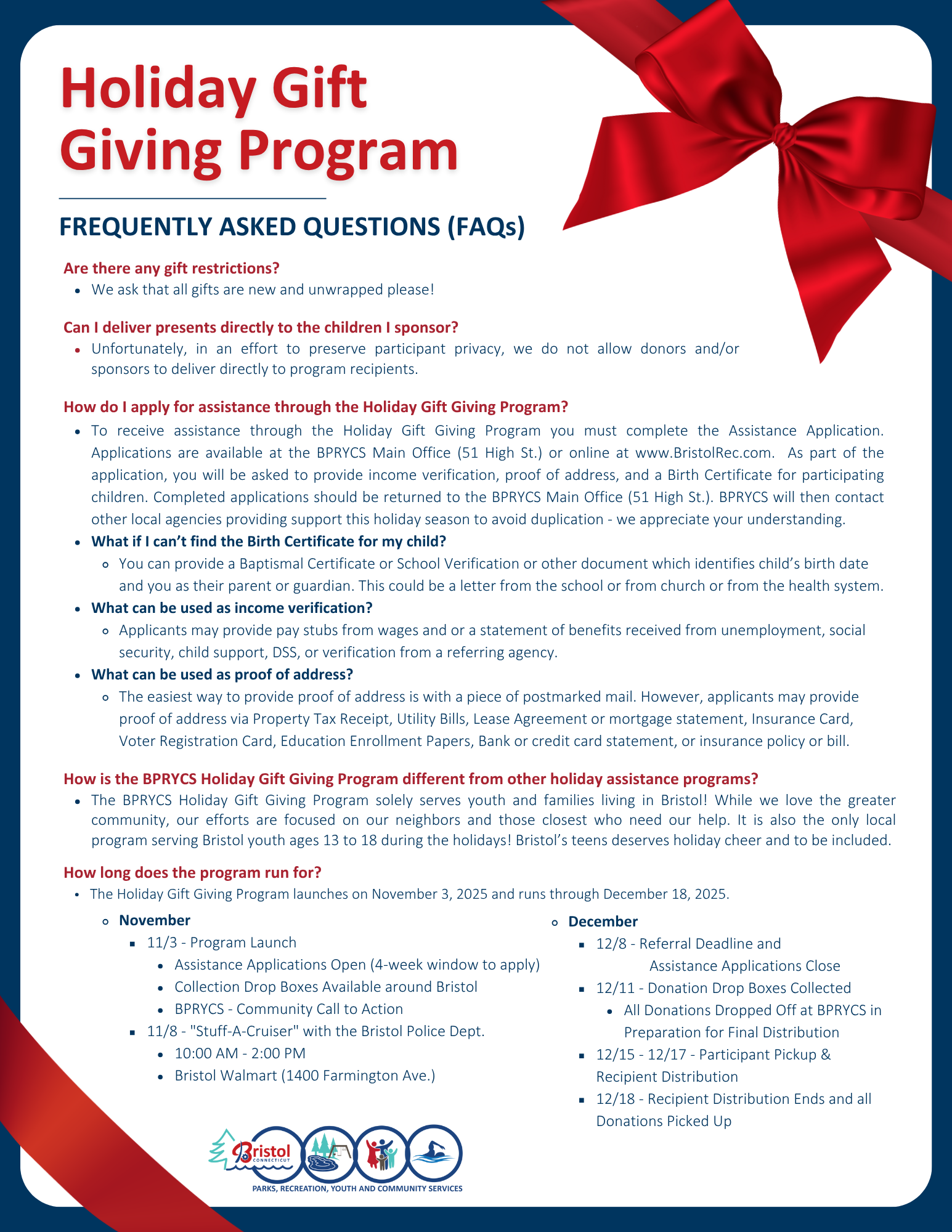 The Holiday Gift Giving Program provides gift assistance to eligible Bristol youth and families during the holiday season.