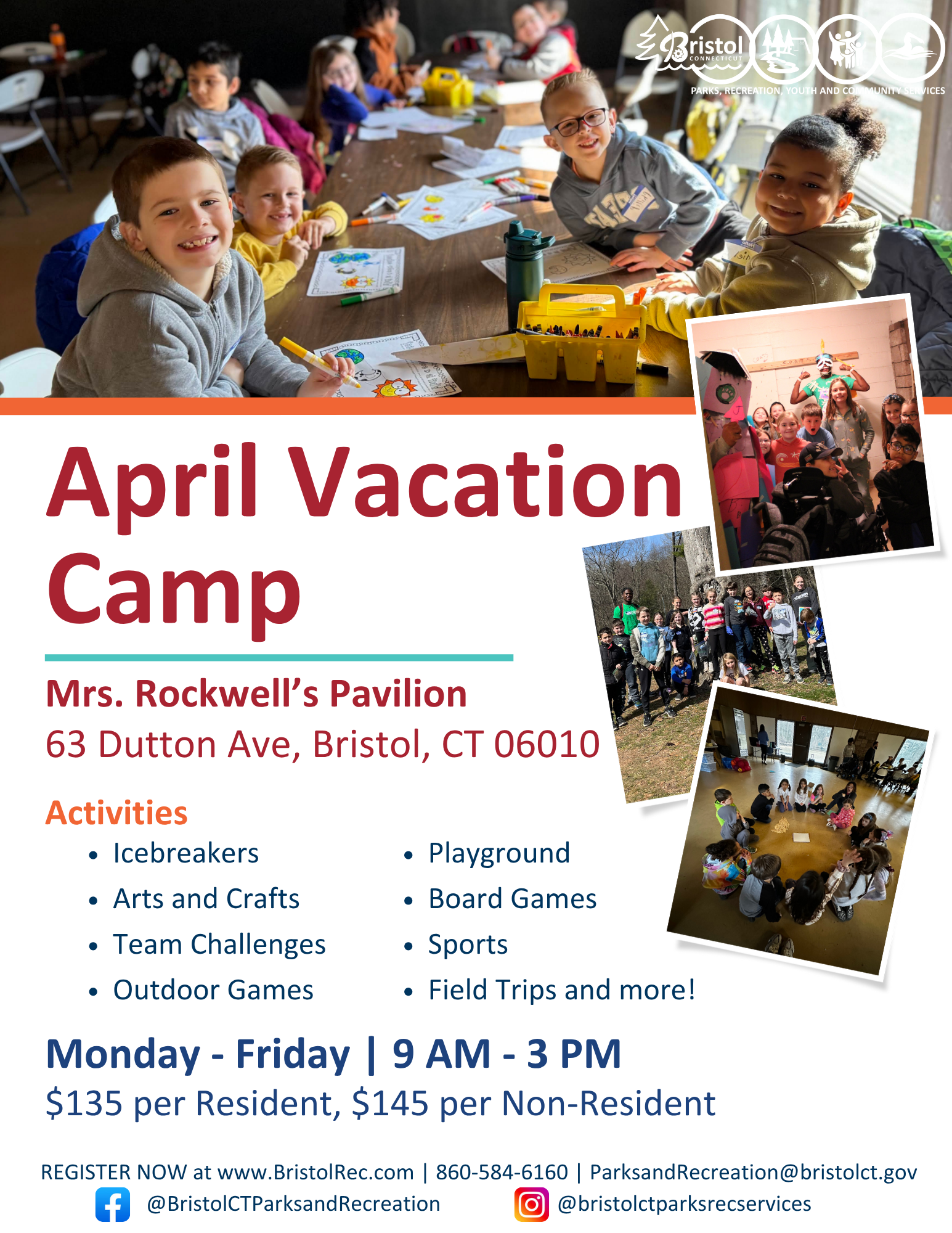 Registration for April Vacation Camp will begin at 12:00 PM (Noon) on Tuesday, December 2nd for Bristol Residents and Wednesday, December 3rd for Non-Residents.