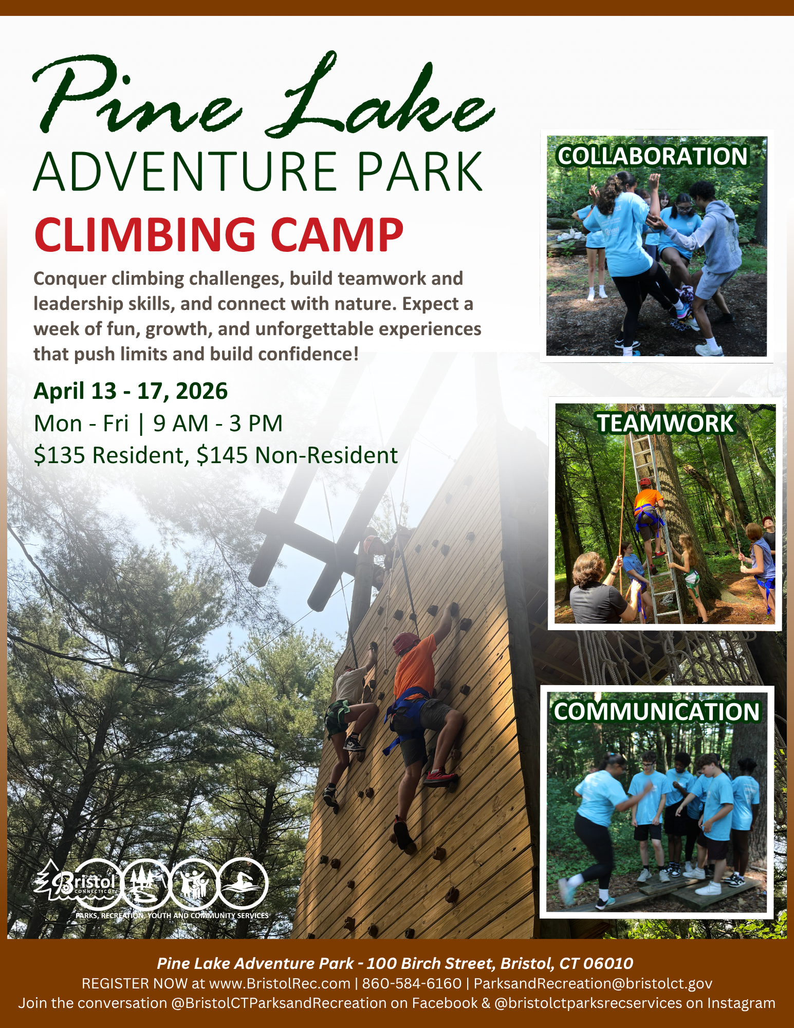 Join Bristol Parks, Recreation, Youth and Community Services (BPRYCS) at Pine Lake Adventure Park (PLAP) for our outdoor climbing camp taking place during BPS April/Spring Break (April 13-17). This immersive experience is designed to challenge campers of all skill and comfort levels, fostering both physical and emotional growth through a variety of exciting activities and lessons. Throughout the week, campers will engage in a combination of low and high elements at PLAP, offering opportunities to push personal boundaries, improve physical endurance, and most importantly, have fun. In addition to climbing, our camp will emphasize ground games and activities, which are designed to strengthen team dynamics, enhance communication, and cultivate a sense of camaraderie among participants. These interactive activities encourage participants to trust each other, build leadership skills, and learn how to navigate challenges together.